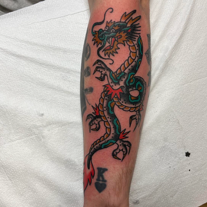 Michael specializes in American Traditional and loves ornamenting all bodies with big, bold projects just as much as he enjoys working piece by piece building you a custom patchwork collection. When Michael isn’t tattooing, you can find him painting tapestries, printmaking with his sisters, reading fantasy, and playing Barbie tattoo shop with his daughter.